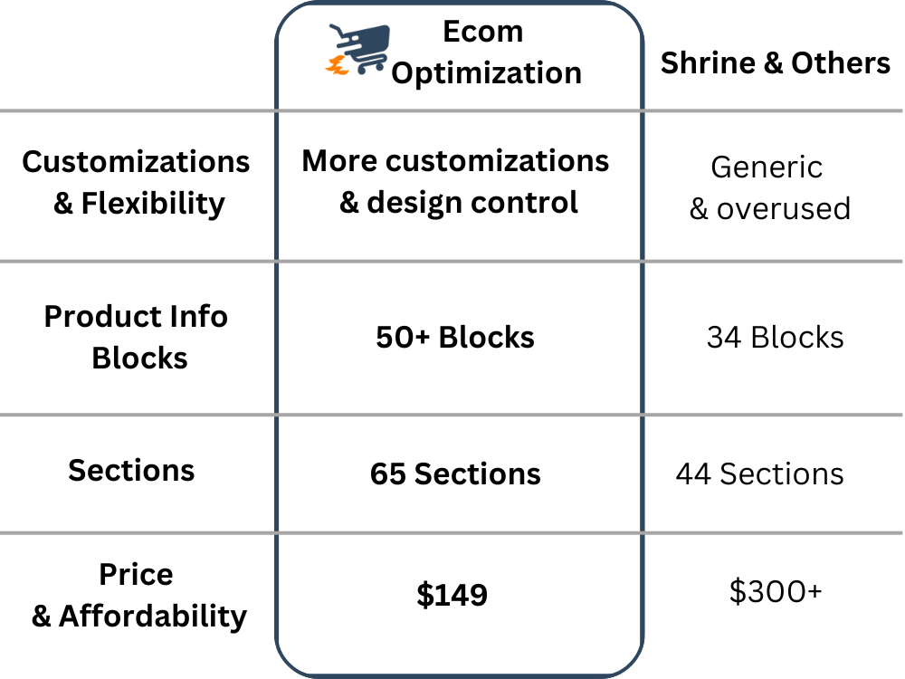 The Ecom Optimization Theme sets itself apart with over 100 premium features, effortless customization, and top-tier support. With a one-time payment, you get a seamless user experience, a responsive design, and access to an exclusive Discord support server—making it the perfect solution for your online store's success. And best of all, it's conversion focused.