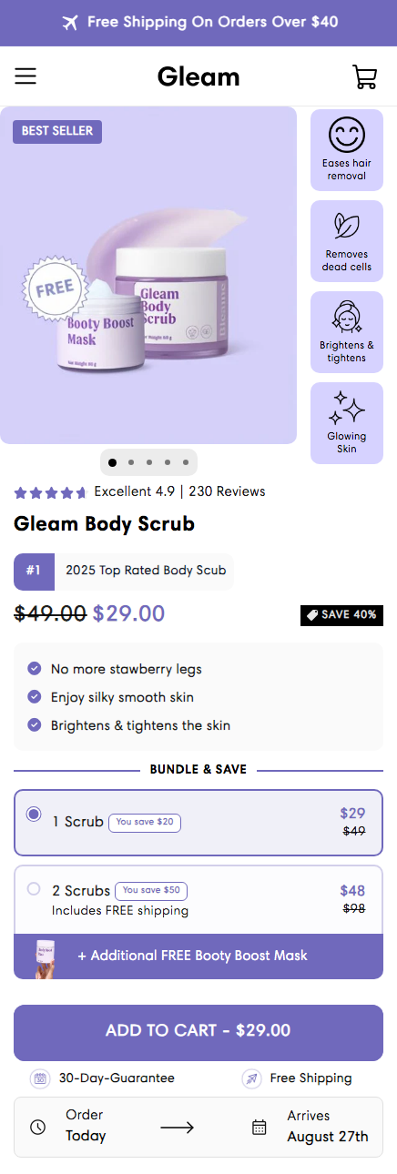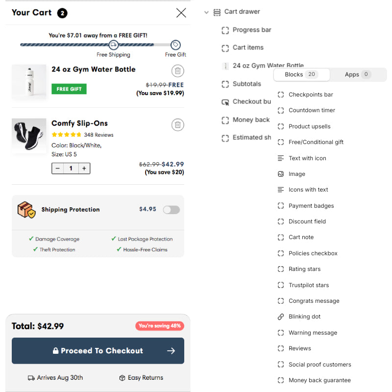 Explore advanced cart capabilities designed to elevate your store's conversion rate and customer experience. Blocks include progress bars, upsells, urgency, scarcity, gifts & much more.
